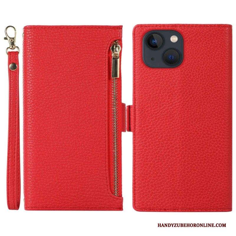 Custodia in pelle iPhone 14 Plus Litchi In Pelle Con Cinturino E Cerniera